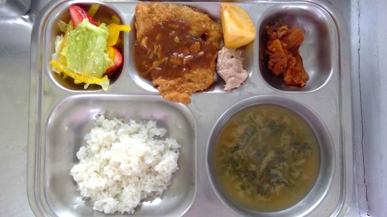 쌀밥쑥국(5.6)딸기샐러드-레몬드레싱(12.13)참치마요(1.5.16.18)직접만든돈까스(1.2.5.6.10.12.13.16.18)김치볶음(9)단감(자율)781.80/35.19/280.78/2.64
