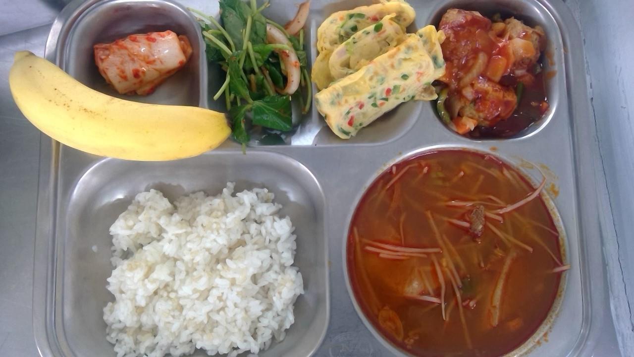 현미밥쇠고기콩나물국(5.6.16)수제미트볼(1.2.5.6.10.12.13)야채계란말이&케첩(1.2.5.6.10.12.15.16)배추김치(9)참나물겉절이(자율)(13)바나나(반개씩)697.7/40.1/286.8/3.9