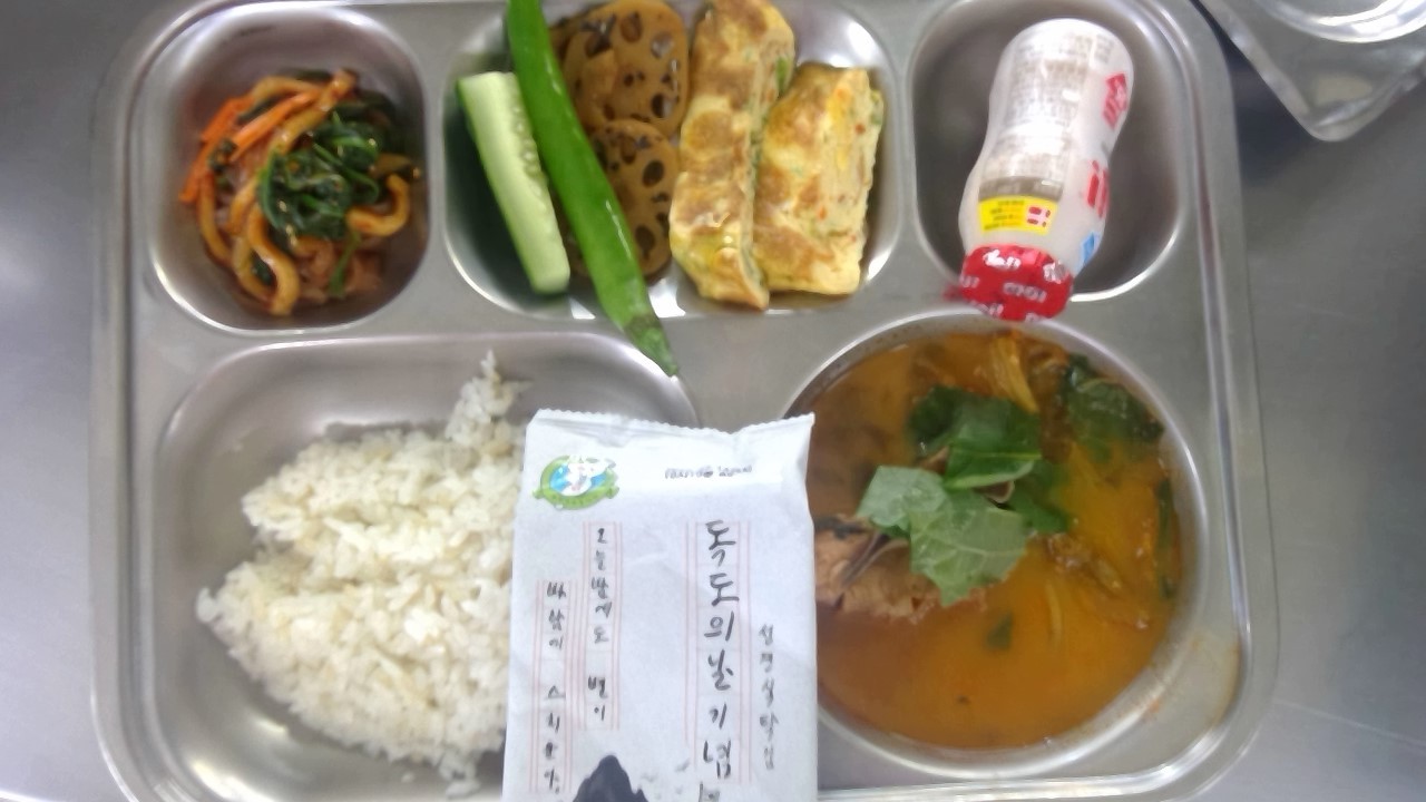 찰보리밥김치등뼈감자탕(5.6.9.10.13)비빔당면(1.5.6.13)가쓰오계란말이(1.5.6.13)김구이아삭고추,오이-(자율)(5.6.13)연근조림(자율)(5.6.13)