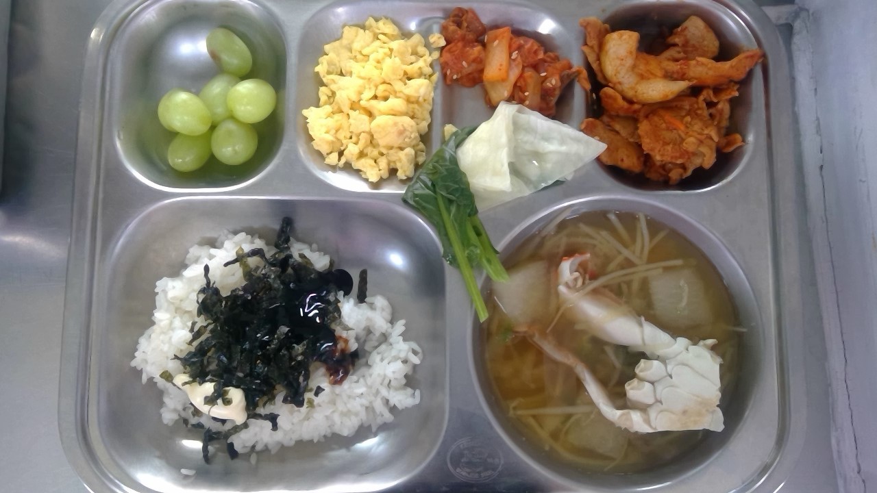 쌀밥&김가루(13)꽃게탕(5.6.8)스크램블에그(1.2.12)제육볶음(5.6.10.13)김치볶음(9)데리야끼&마요소스(1.5.6.13)씨없는 포도케일양배추쌈(자율) 766.95/45.49/361.09/4.73