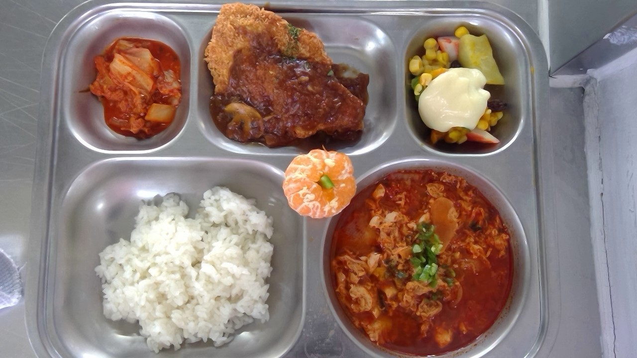 현미밥계란순두부찌개(1.5.6.9.12.13.17.18)직접만든치킨까스(1.2.5.6.12.13.15.16.18)김치볶음(9)단호박고구마샐러드(1.5.13)호박이 되고픈 귤773.44/35.45/273.26/4.15