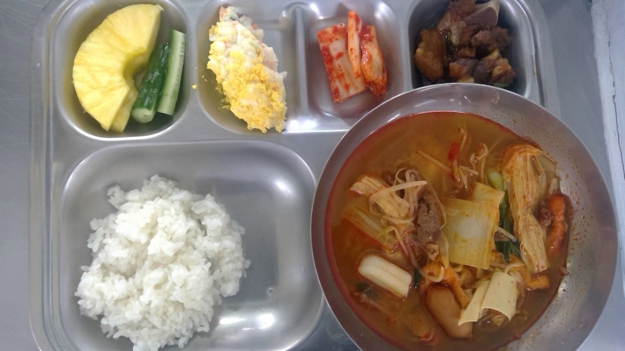 쌀밥마라탕(2.4.5.6.10.13.15.16.18)돼지갈비찜(5.6.10.13)감자샐러드(1.5.6.8)배추김치(9)골드파인애플아삭고추,오이(자율)(5.6.13)877.35/28.62/331.02/4.10