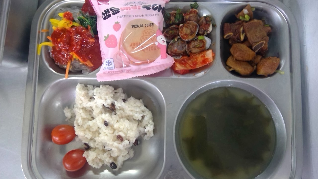 찰밥쇠고기미역국(5.6.16)비빔당면(1.5.6.13)돼지갈비구이(5.6.10.13)배추김치(9)카스테라(1.2.5.6)꼬막양념장(자율)(5.6.13.18)대추방울토마토*(12)709.46/25.44/125.95/4.39