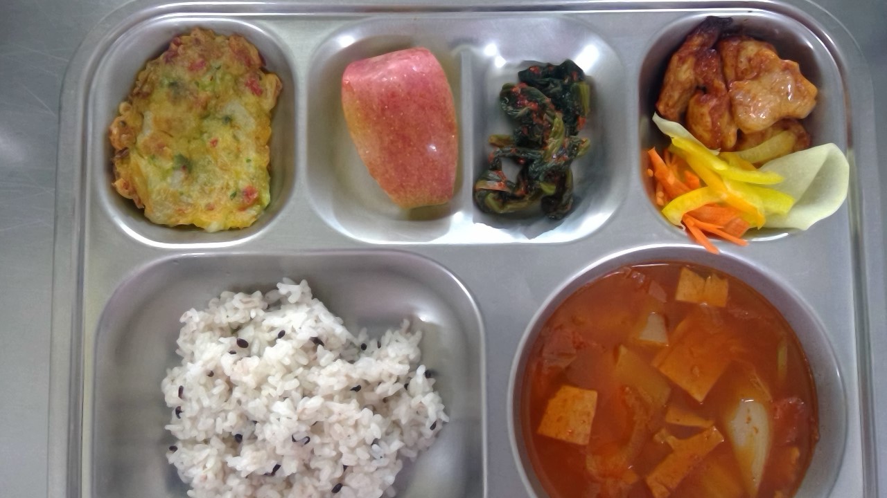 흑미밥햄김치찌개(1.2.5.6.9.10.13.15.16)닭보쌈(2.5.6.12.13.15.18)애호박양파전(6.9)갓김치(자율)(9)미역줄기볶음(자율)사과747.85/32.84/249.28/2.65