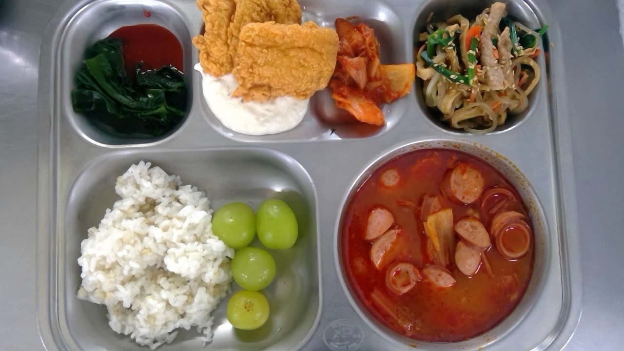 찰보리밥부대찌개(1.2.5.6.9.10.12.15.16)잡채(1.5.6.10.13)피쉬앤칩스(1.2.5.6.9.12.13.15.16.18)김치볶음(9)씨없는 포도생미역(자율)(5.6.13)835.46/30.69/306.89/3.85